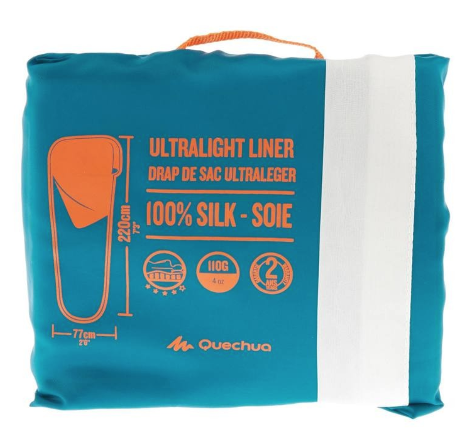 J’y ai ajouté également un drap de sac (sac à viande) en soie, de la marque Décathlon, pour l’hygiène, mais également en espérant compléter l’effet thermique au cas où des températures limites se fassent ressentir.