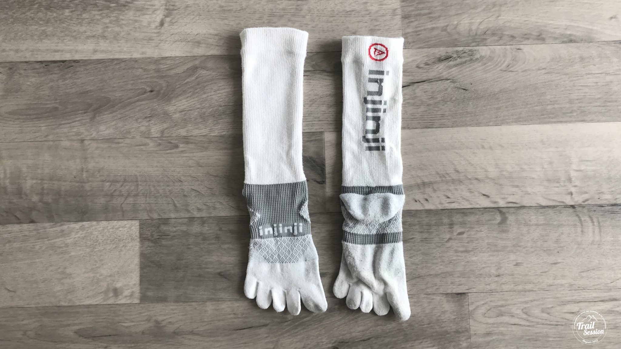 J’aimerais juste partager avec vous un dernier élément. Cet élément c’est les chaussettes. J’ai fait le pari d’oser la chaussette doigt de pied et j’ai pris la marque Injinji. Je me dis que ça peut limiter les frottements. J’ai également pris une paire « traditionnelle » supplémentaire au cas où tout de même.
