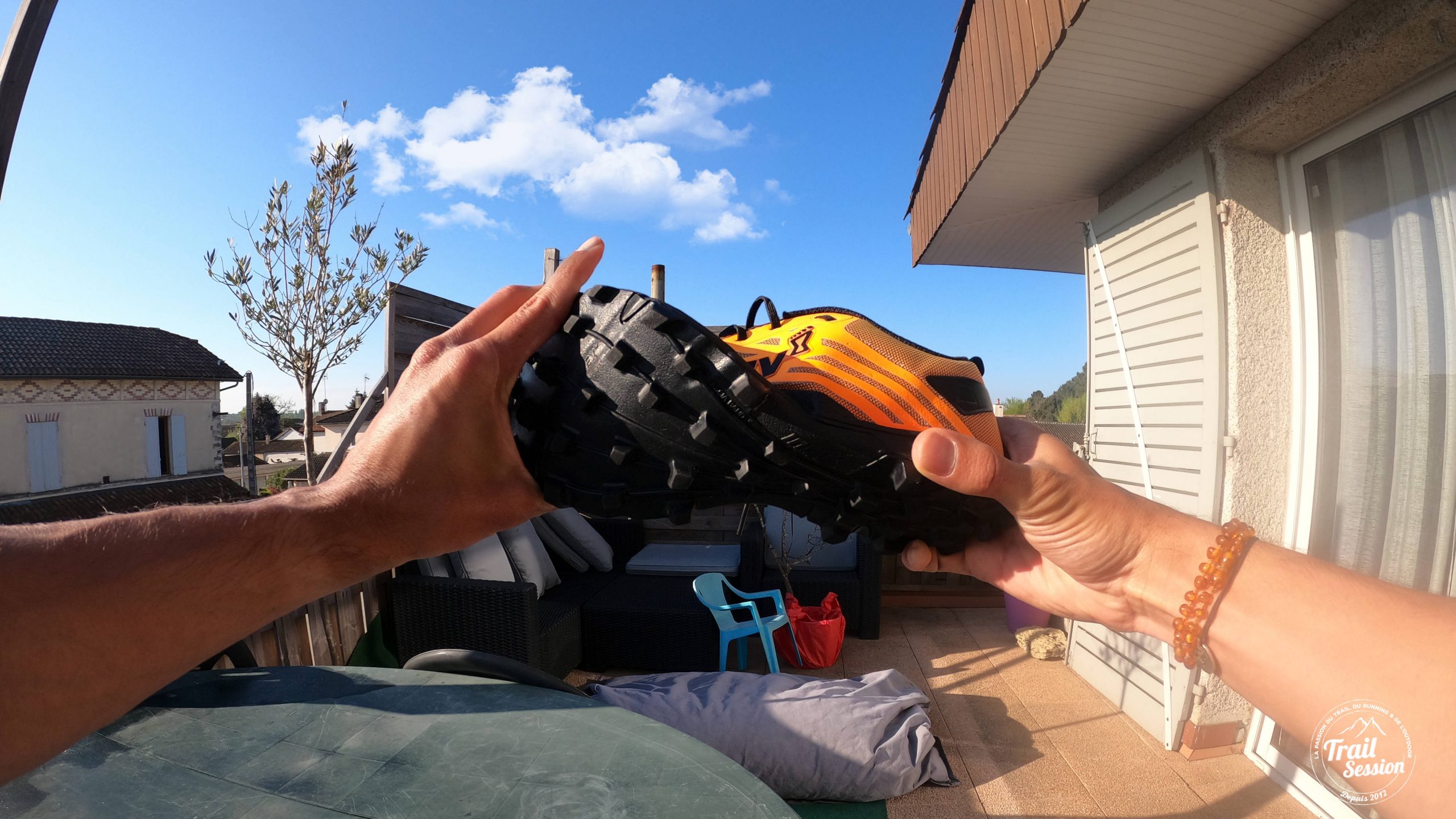 La semelle en graphène et les gros crampons jouent le rôle d’un léger amortisseur car elle ne tape pas trop sur du bitume. Je ne dis pas qu’on ne sent pas les gros crampons mais cela n’est pas désagréable en soi.