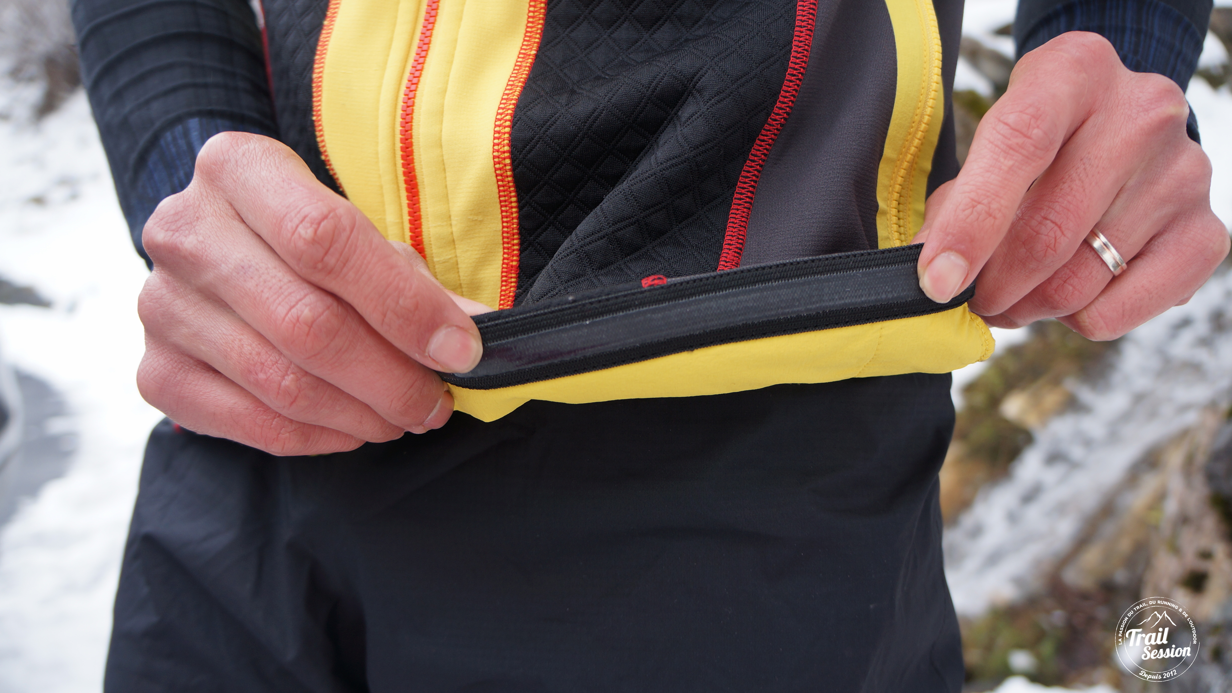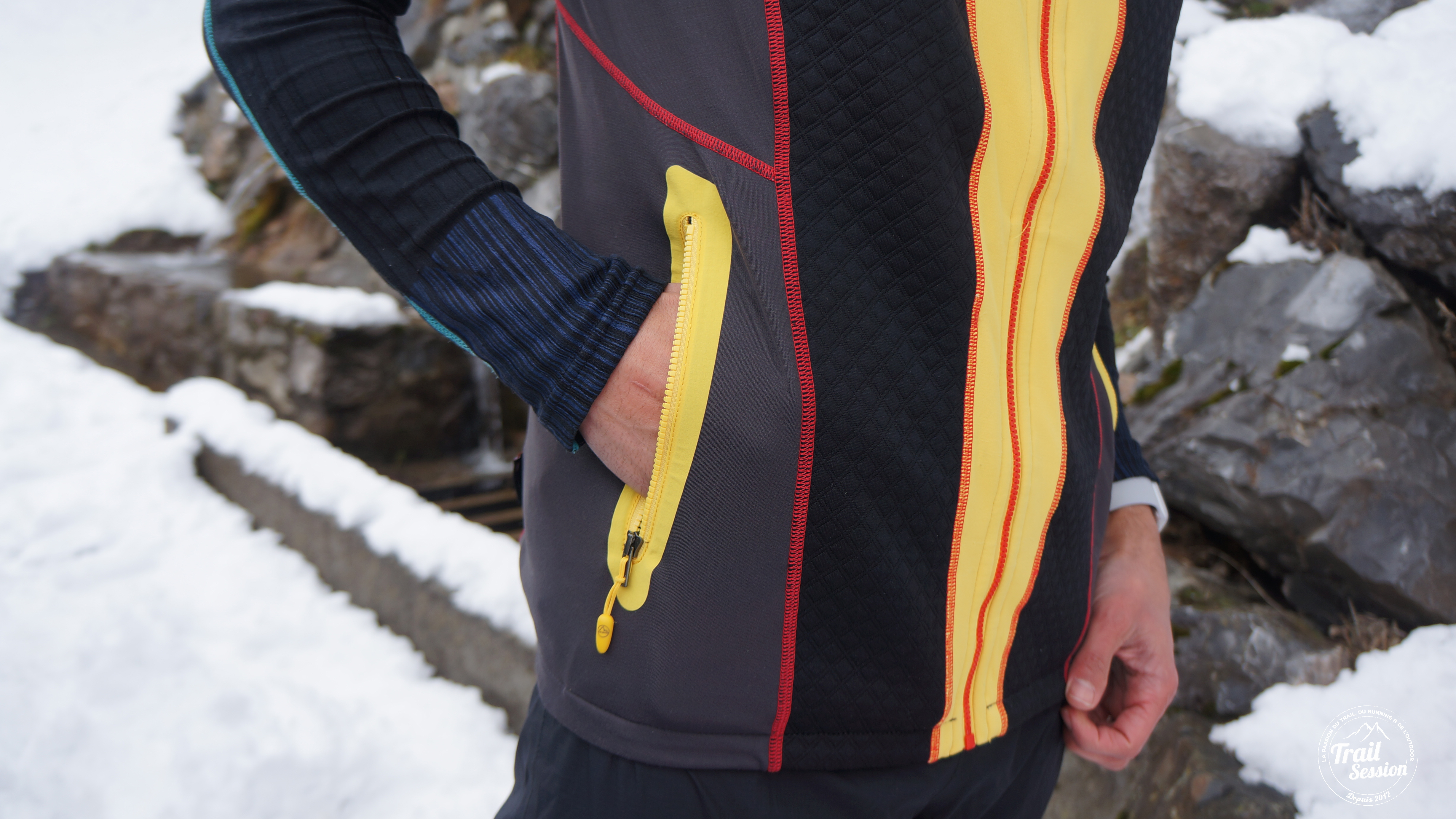 En effet, ce dernier à tendance à balloter et du coup à gêner un peu. Dommage car La Sportiva a pensé à intégrer un passant pour écouteur. Je préfère donc une poche plus cintrée et placée au niveau de la poitrine pour l’emploi de baladeur par exemple. Dans la pratique de sport outdoor comme le ski alpinisme aucun problème.