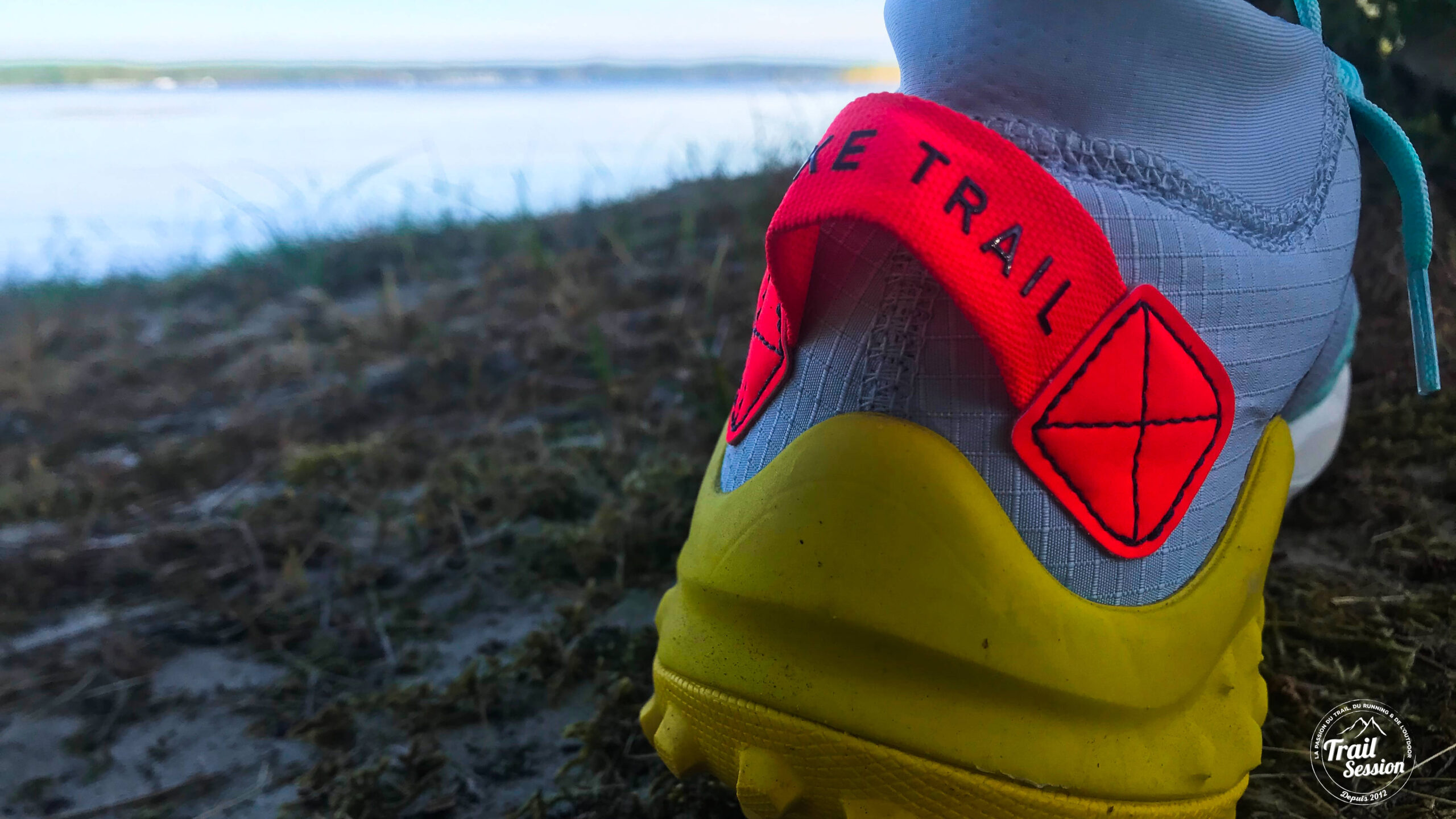 Des lanières aux couleurs vives situées à l’arrière de la chaussure permet un enfilage plus facile. L’inscription « Nike Trail » montre clairement le domaine de prédilection de cette chaussure.