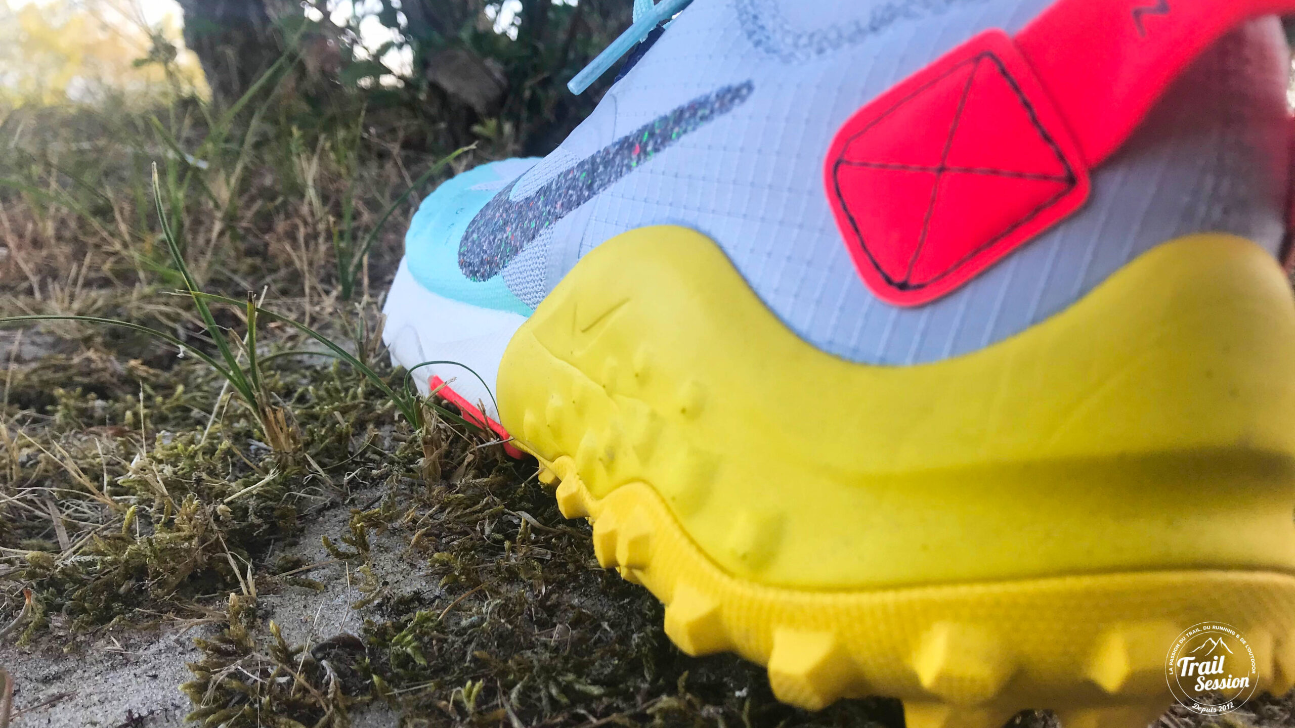 Sa semelle extérieure aux crampons assumés, montre à quel point Nike à souhaité corriger ce qui fait faux bon à ses chaussures de trail : l’accroche.