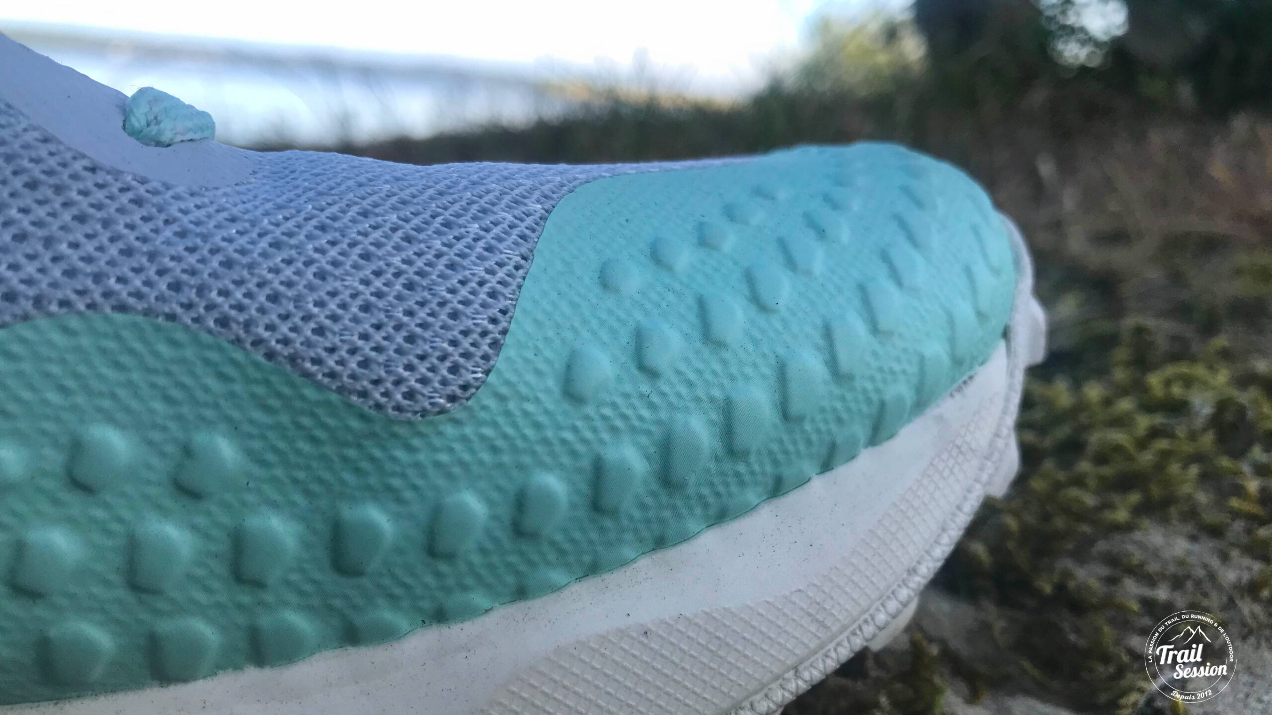 Le drop, quant à lui, reste identique à la version précédente. On retrouve un drop modéré de 8 mm avec une hauteur de semelle de 22,5 millimètres au niveau du talon et de 14,5 millimètres pour l’avant du pied.