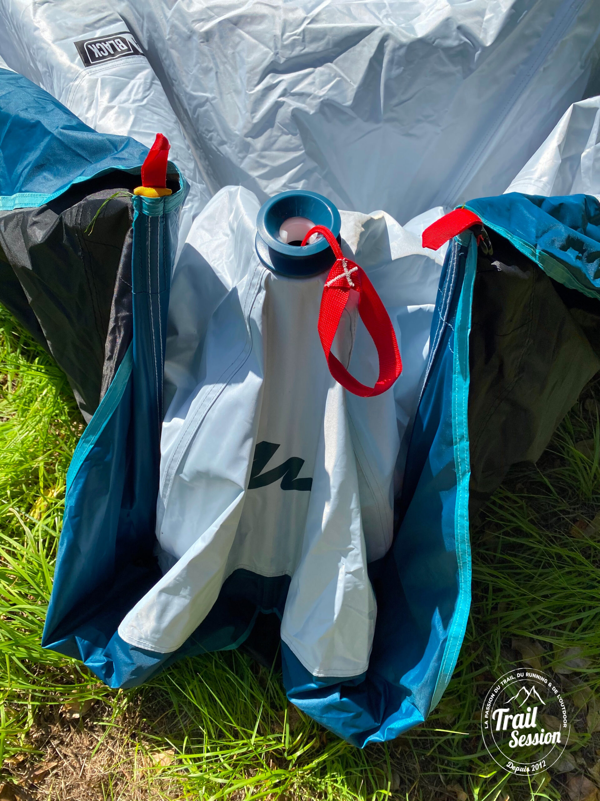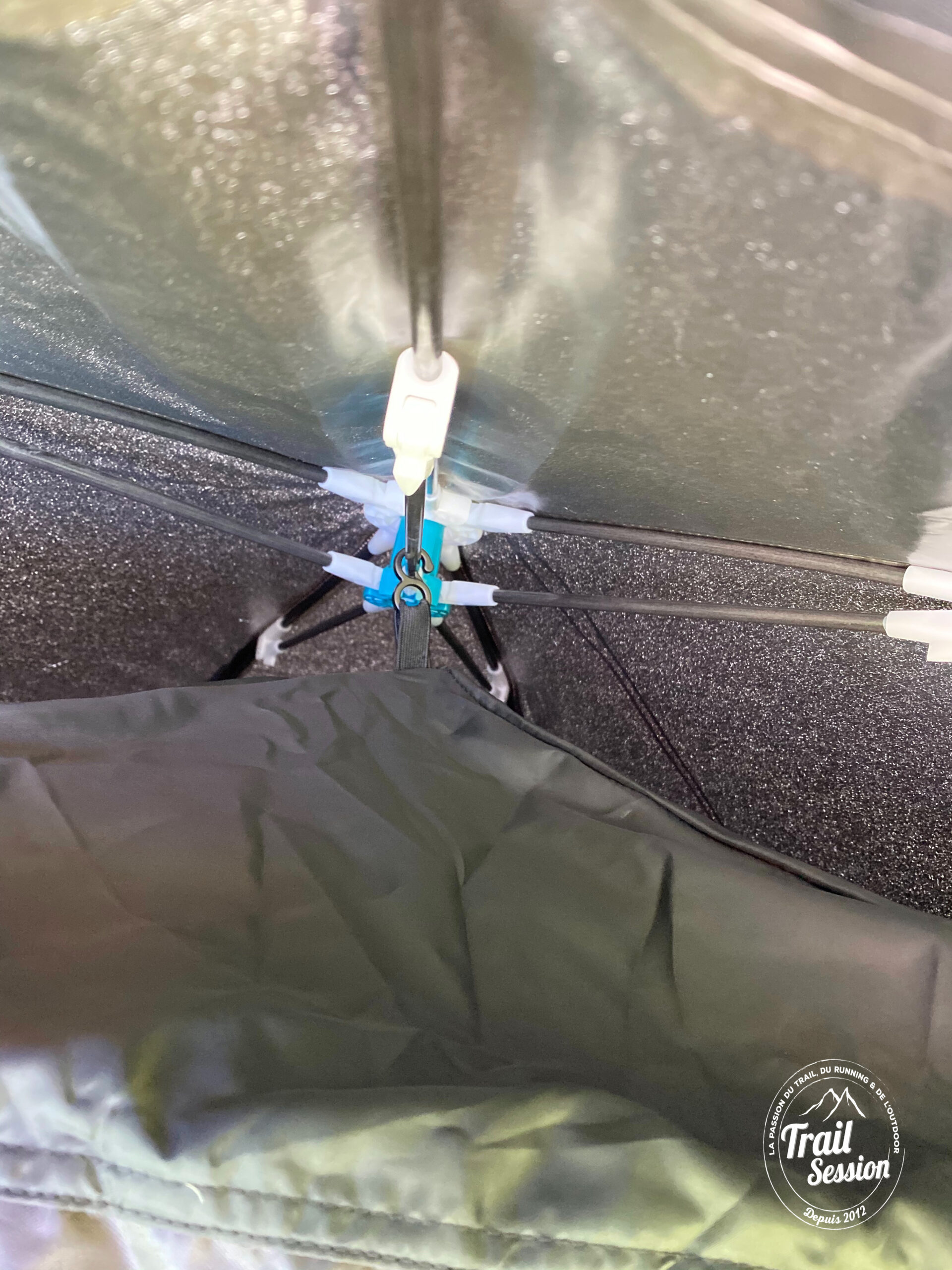 A l’intérieur, on arrive à voir la structure qui aidera à rigidifier la tente. C’est plutôt rassurant. Deux côtés symétriques permettent une structure spacieuse et solide. Le bouton poussoir aidera au montage et au reliage. Je l’ai fait à plusieurs reprises et cela fonctionnait bien.