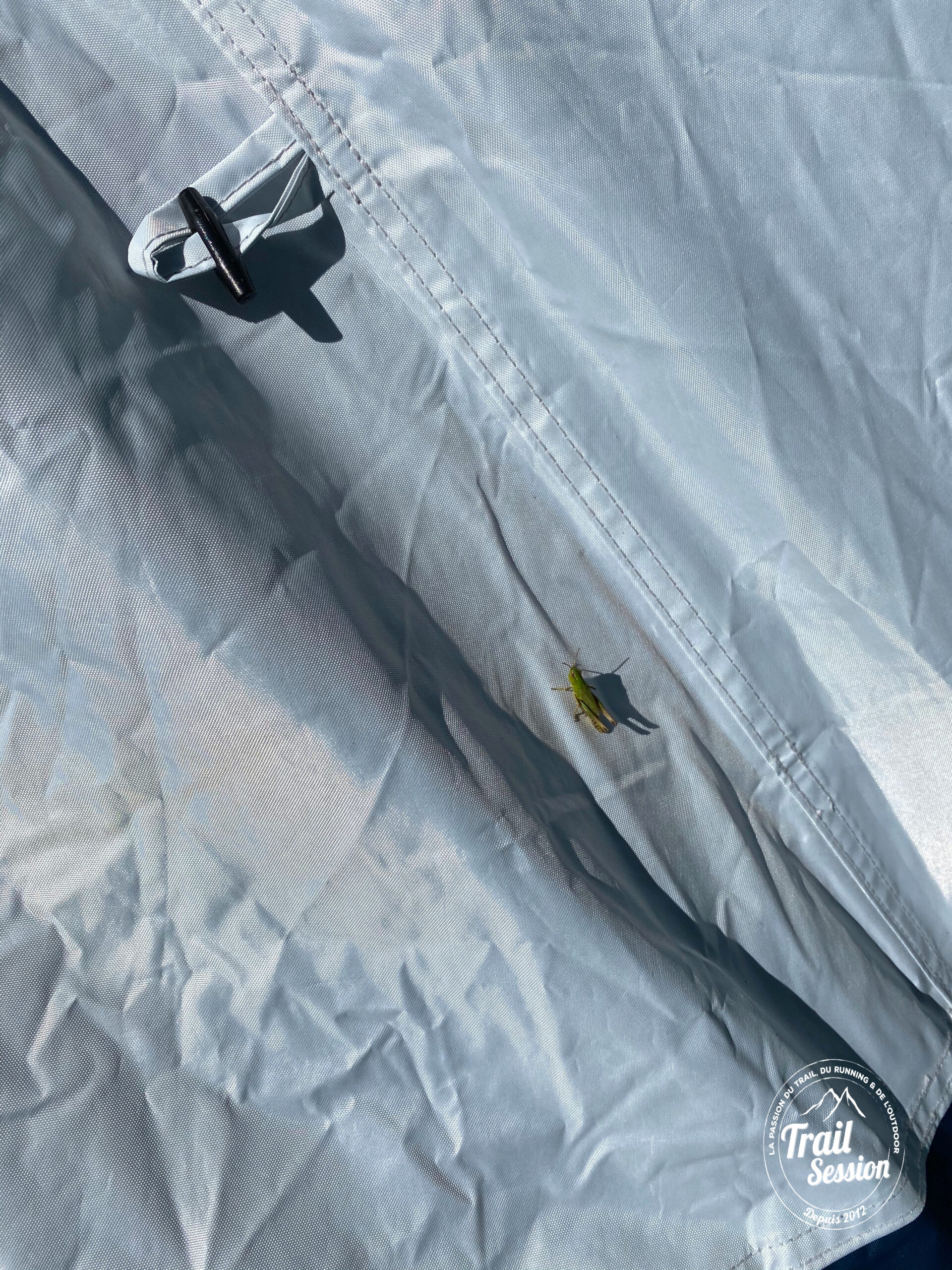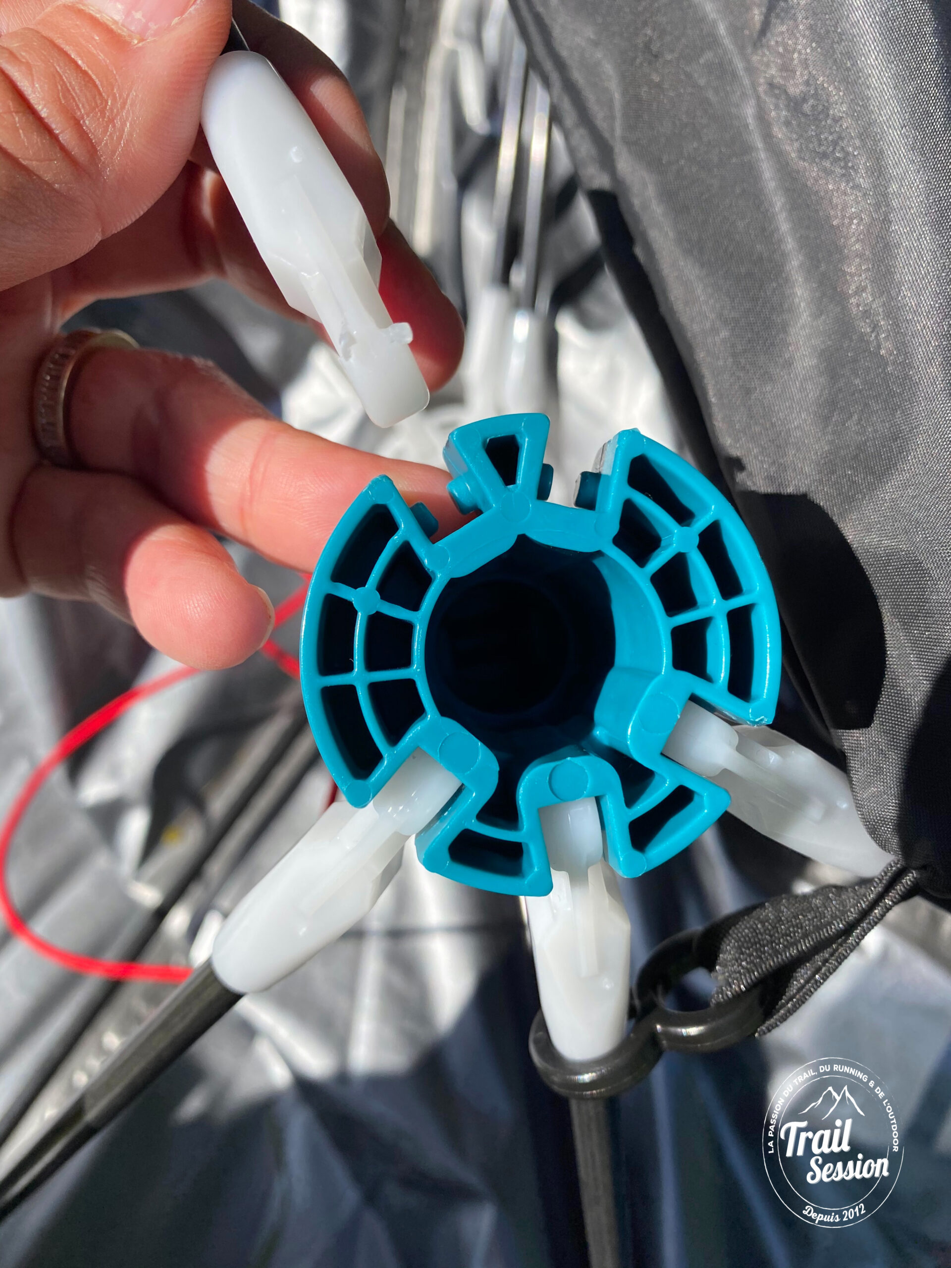Sauf que, lors d’un montage, je n’ai plus réussi à ouvrir et le système d’ouverture semblait bloqué. Je regardais plus précisément et je ne voyais plus le système si précieux. Moment d’angoisse ! Comment allais-je dormir si un des côtés ne tenait pas bien ? Je remis la tente à l’envers et tentai de reclipser les deux barres qui s’en étaient allées.