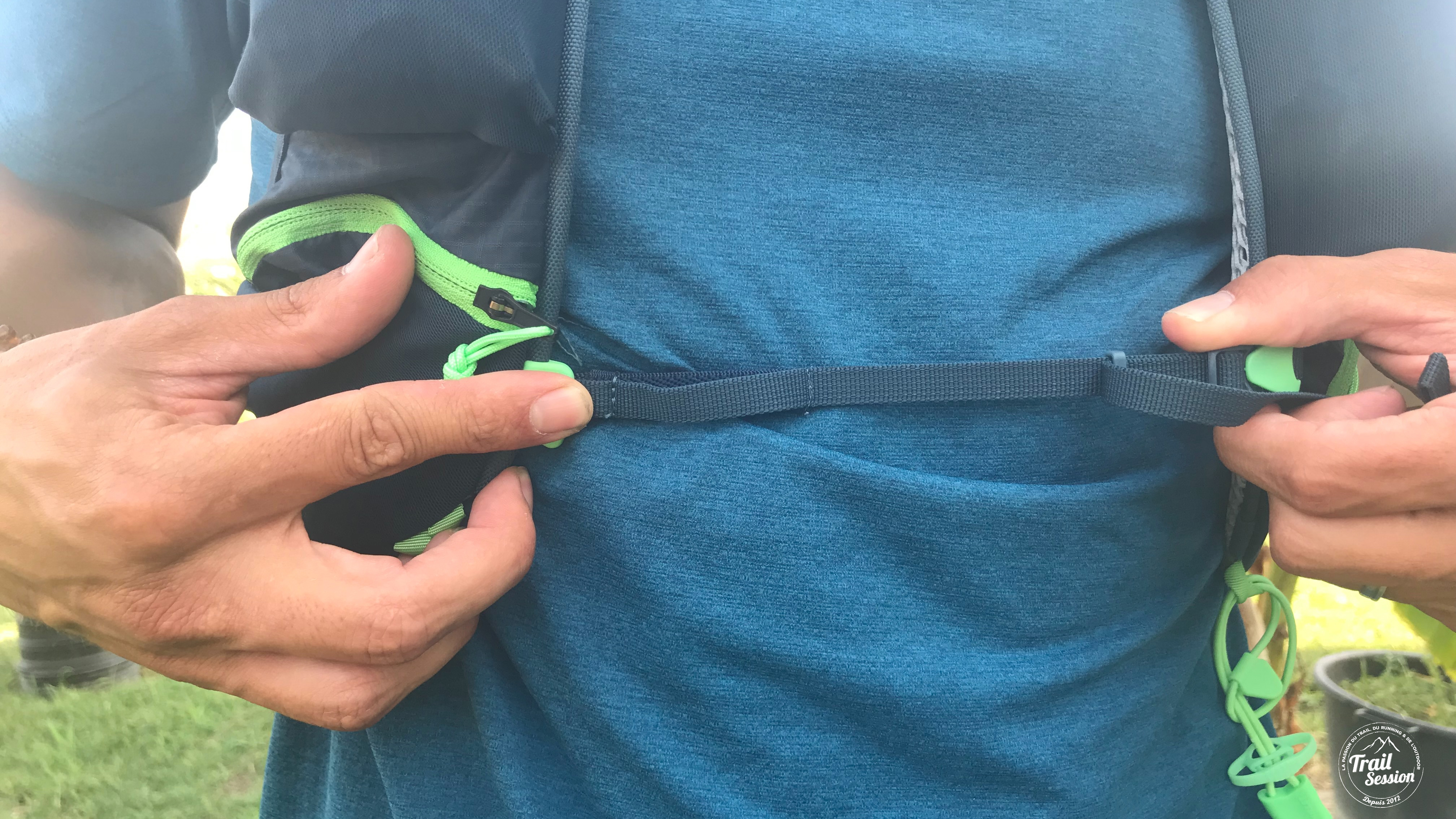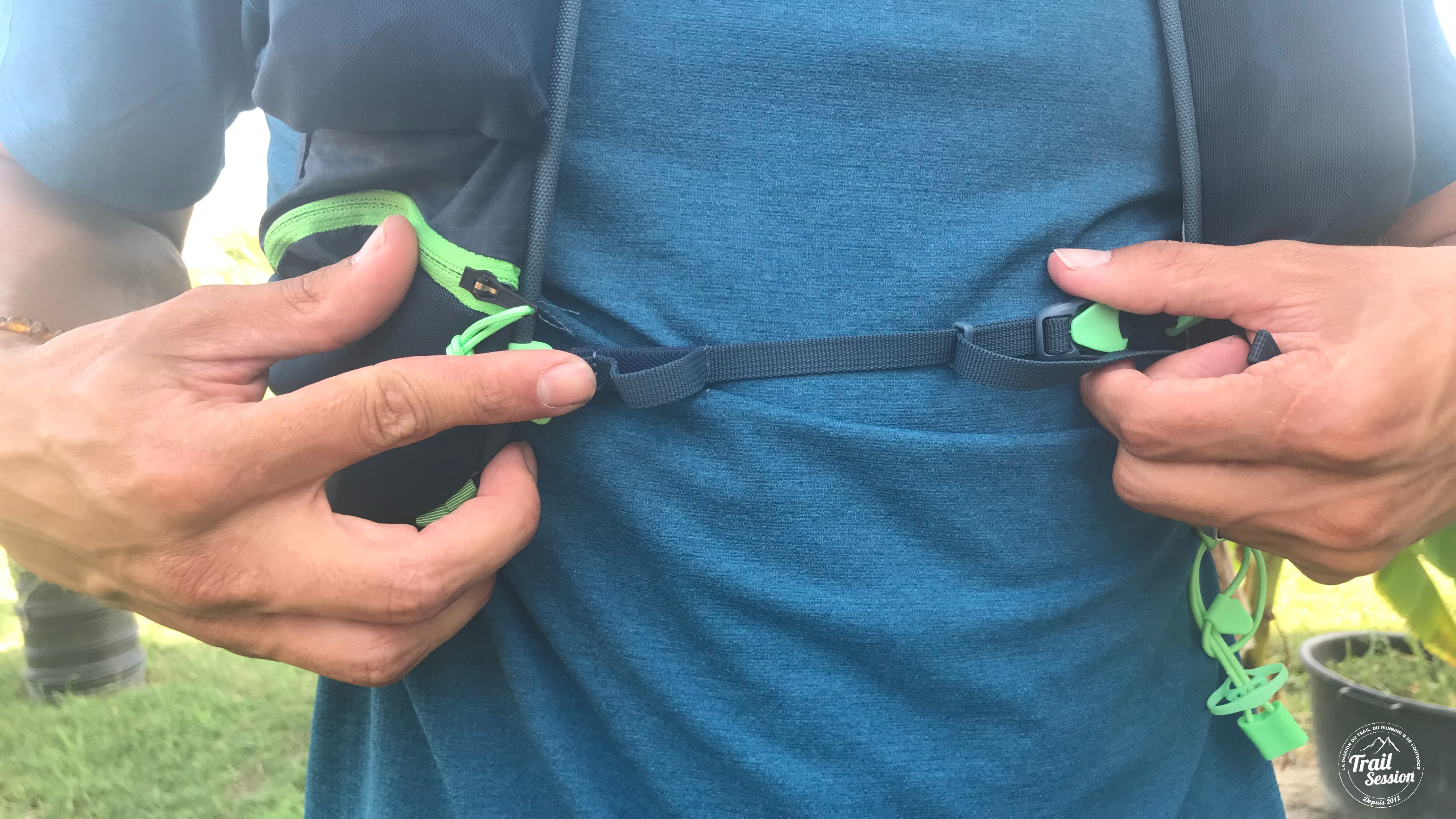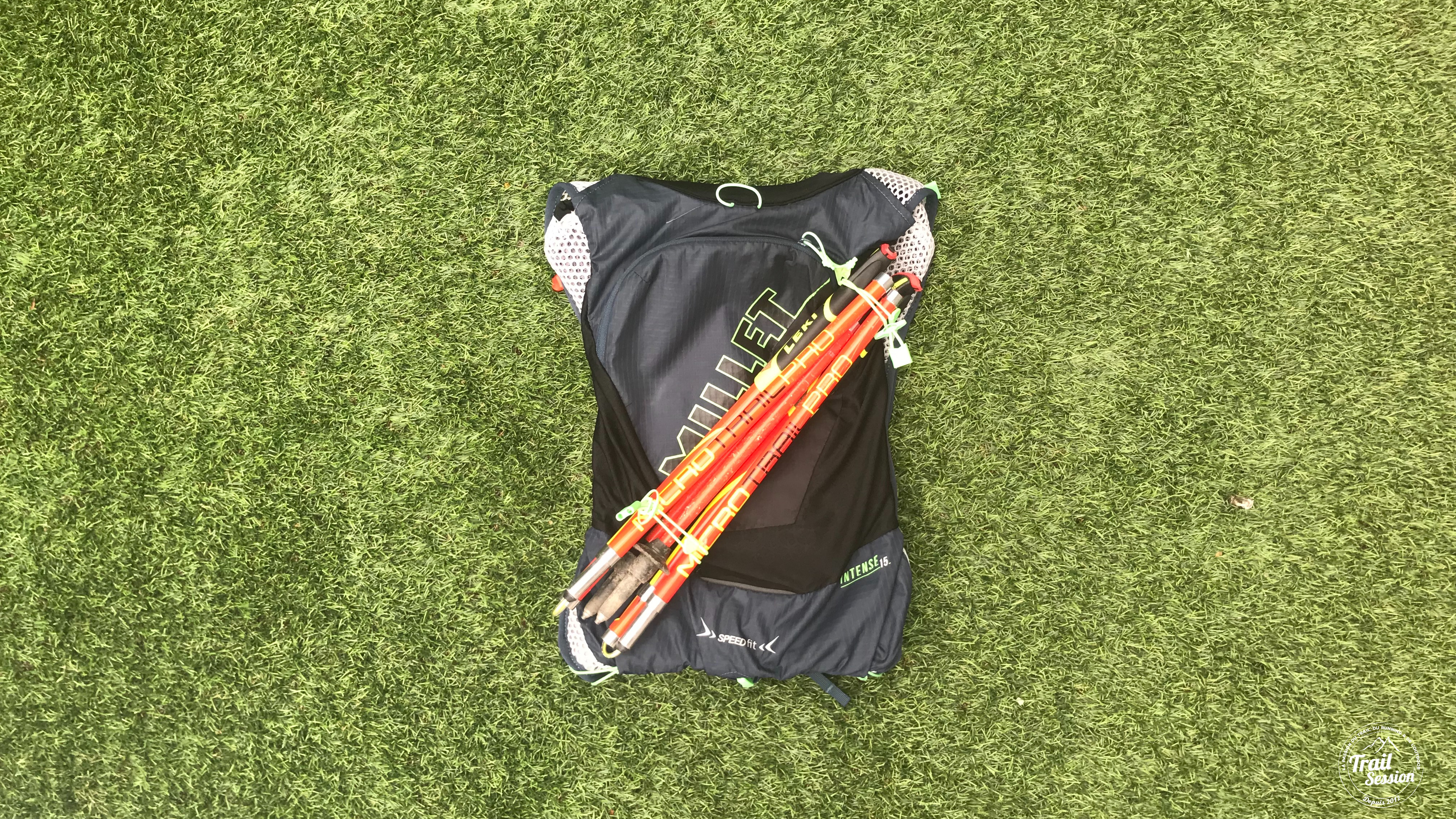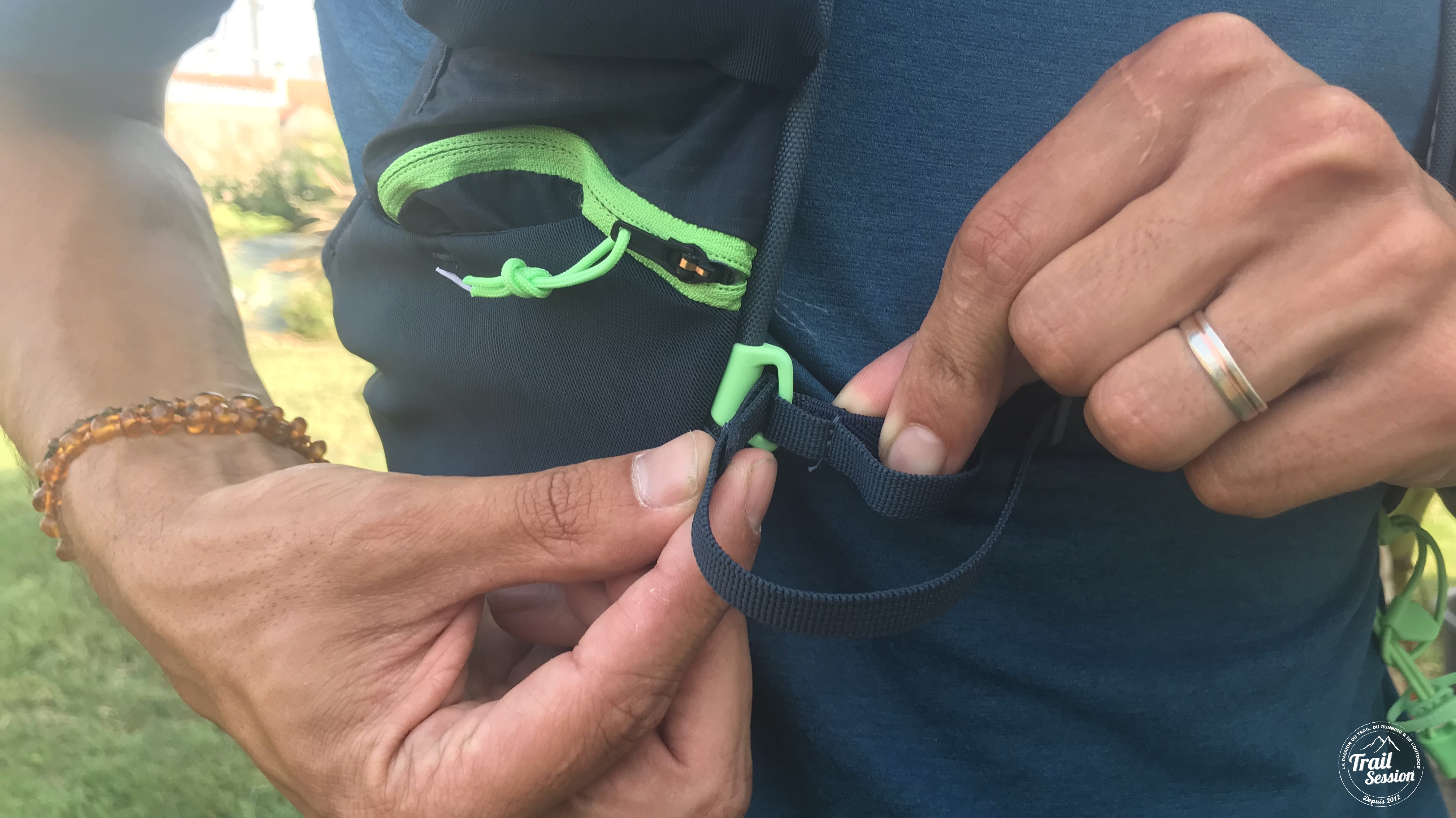 Pour les fervents utilisateurs de bâtons, deux solutions s’offrent à vous. Soit la mise en place de ces derniers sur l’avant du sac (à l’arrière du coureur), soit deux emplacements au niveau des bretelles qui permettent un portage à l’avant du coureur. C’est une attache classique que l’on retrouve sur d’autres sacs et qui fait très bien le job.