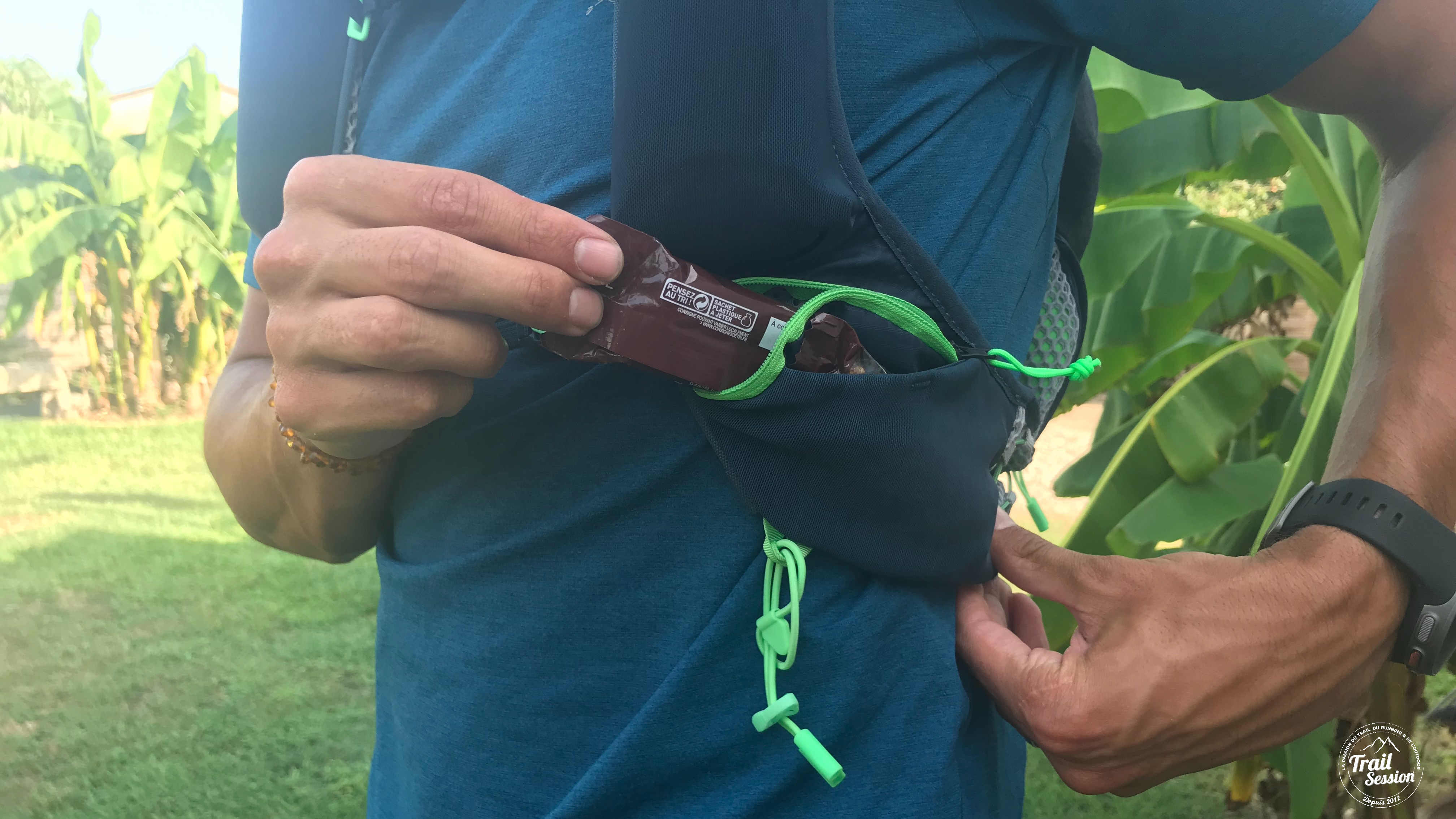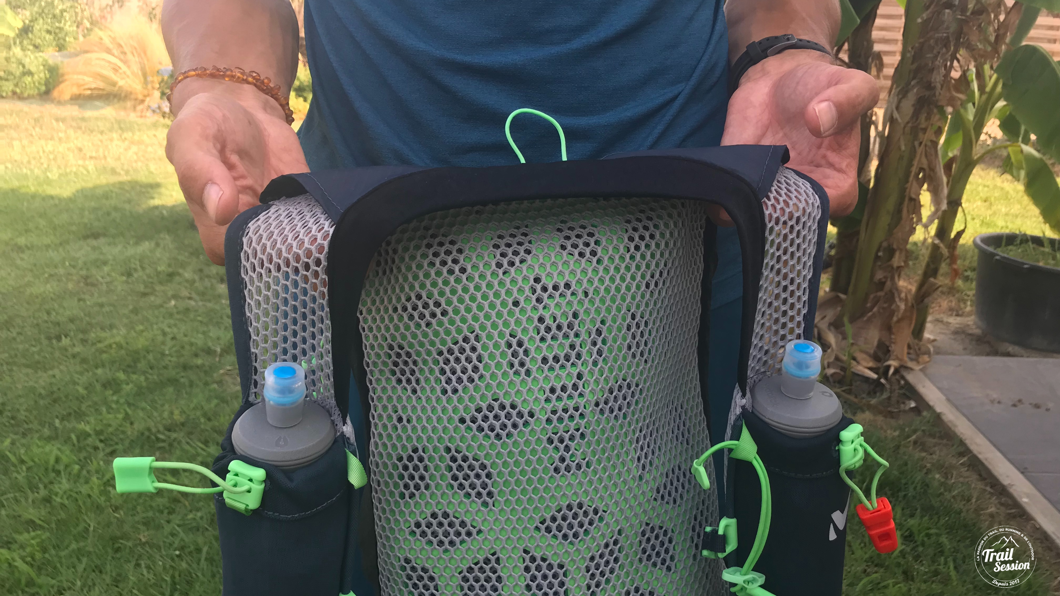 Je vous avoue avoir manqué de rangements aux niveaux des bretelles car ces dernières proposent seulement deux pochettes pour accueillir les flasks Millet de 500ml (livrées avec), deux poches filet zippées pouvant accueillir des barres par exemples… et deux poches extensibles élastiques.