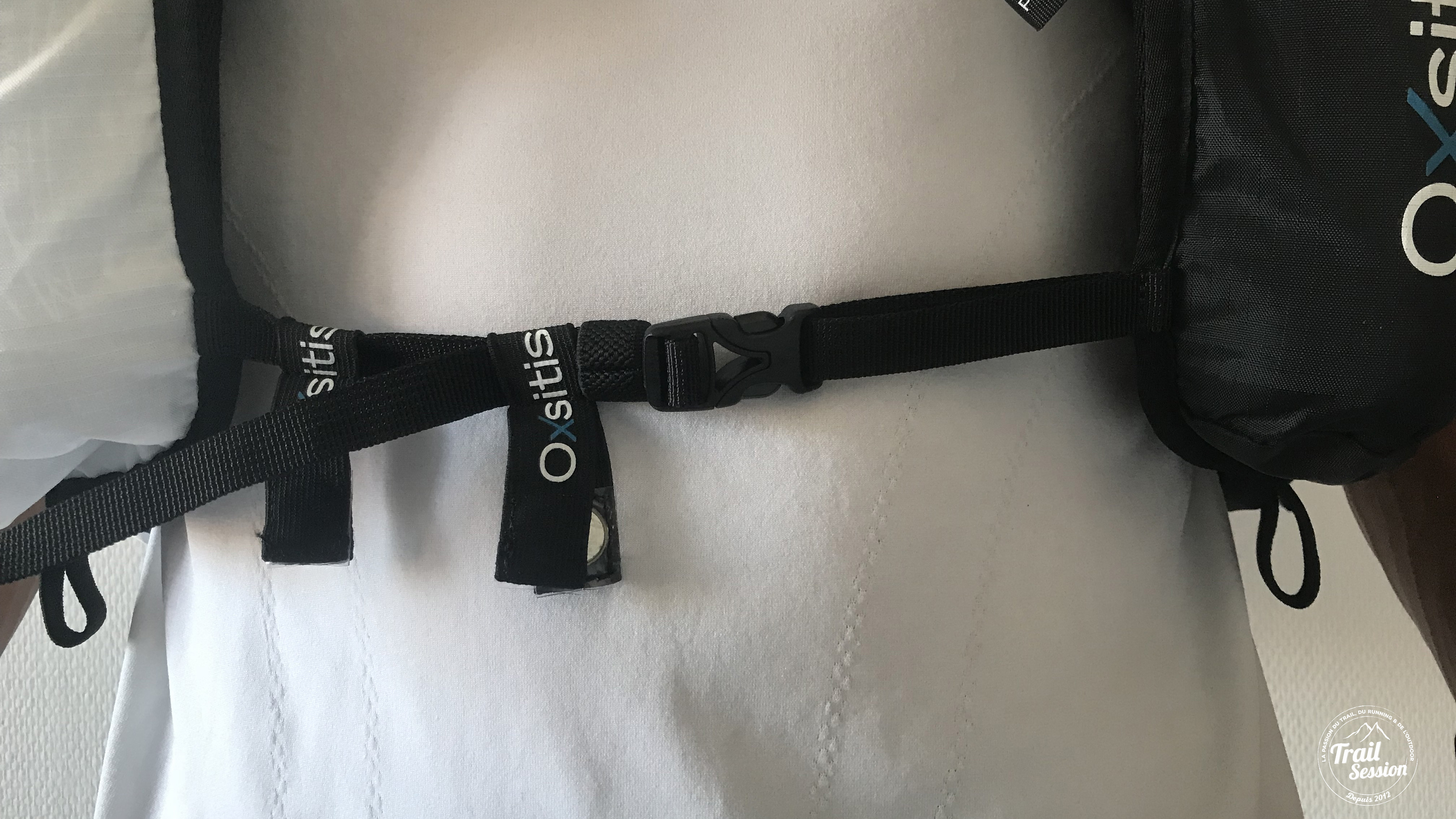 Si j’ai un axe d’amélioration à apporter sur ce sac, c’est sur les sangles ventrales et l’utilisation des porte-dossards aimantés. En effet, une fois la sangle serrée, je me retrouve avec les porte-dossards du même côté, avec un espace entre les deux limites (voir photo ci dessus). Pour ma part j’aurais préféré en avoir un de part et d’autre de cette dernière. D’autant plus que l’efficacité des aimants n’est plus à prouver et c’est hyper pratique.