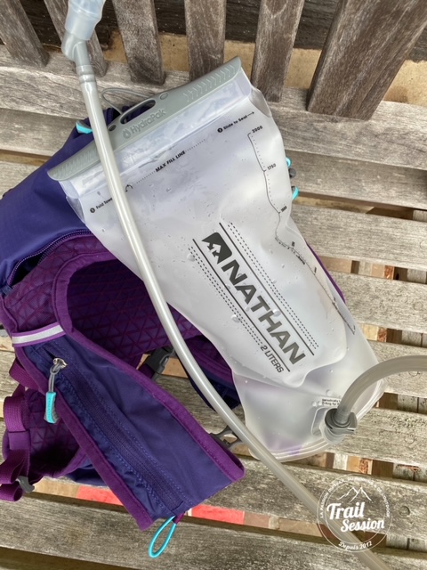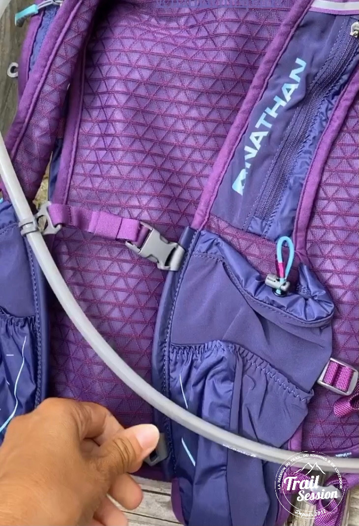 Passons au derrière du sac de trail. Une fermeture éclair permet de mettre la poche à eau de 2L. Elle permettra de pratiquer sa séance de 2/3 heures. Cette poche à peau est fournie avec le sac d’ailleurs. L’embout est facile d’usage. Pour fermer la poche à eau, il y un double système de fermeture pour maintenir l’étanchéité de la poche.