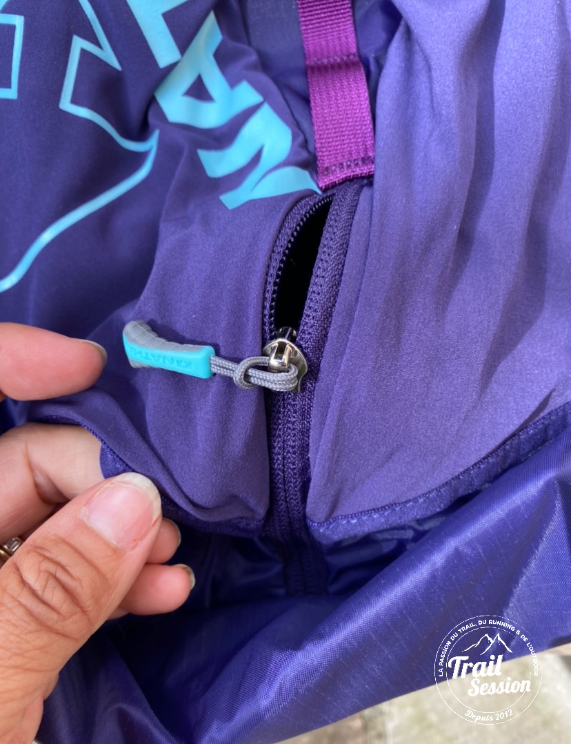 Une fermeture éclair permet d’accéder à une assez grande poche extensible pour y mettre une veste et éventuellement un t-shirt. Sous cette fermeture éclair, des points de fixation/libération rapide pour des bâtons de trail.
