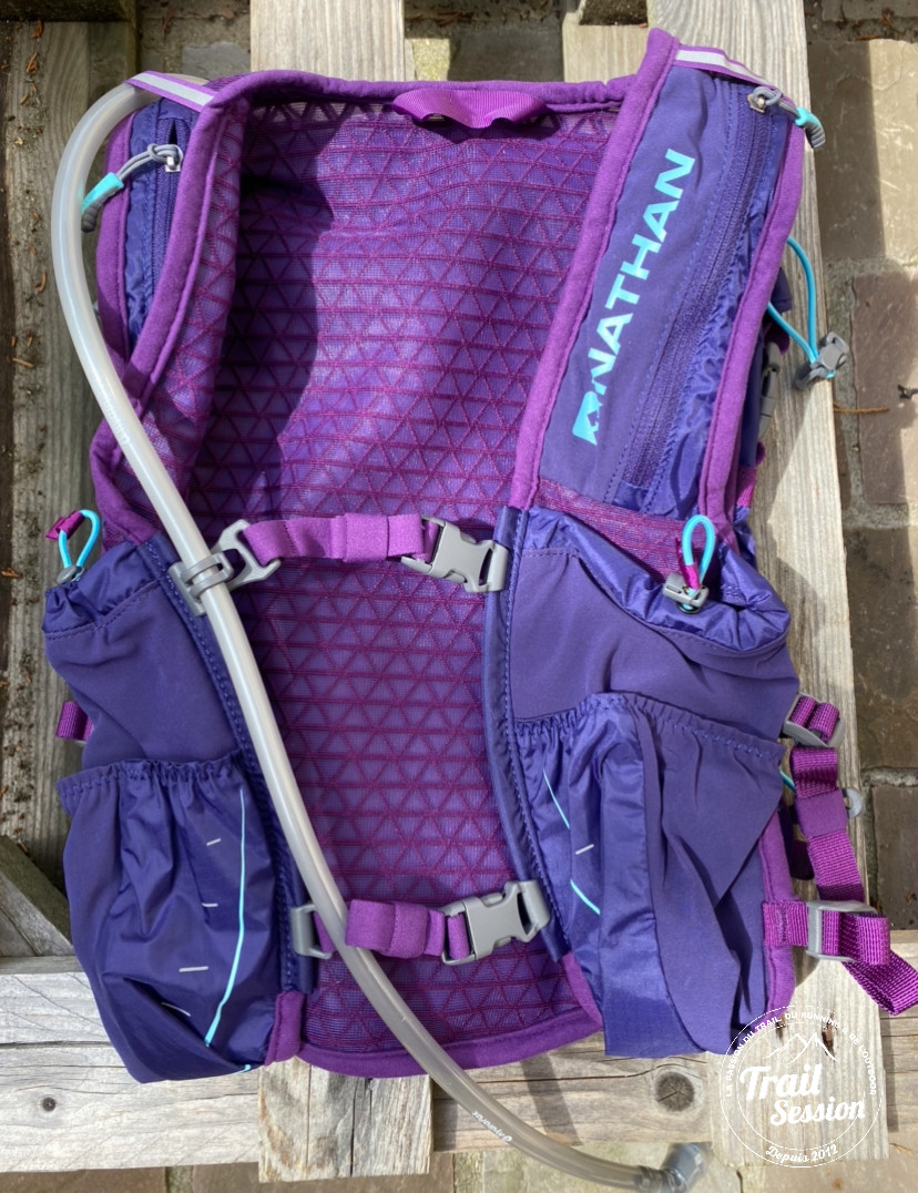 J’ai reçu le gilet d’hydratation TrailMix 12 L Nathan pendant les grandes vacances et ce fut l’occasion de le tester sous une chaleur estivale. La maille est douce, confortable et permet une évacuation de la transpiration et de l’humidité. La matière est très agréable mais quand tu transpires beaucoup et bien, il reste encore cette humidité : le t-shirt est trempé et le sac aussi. Il ne dégouline pas non plus mais c’est mouillé.