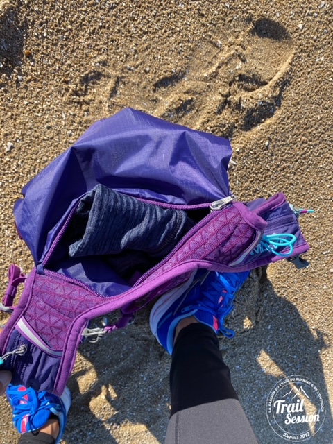 La dernière poche de rangement est vraiment grande. Elle est amovible, selon ce que vous transporterez, vous pourrez plier le haut et avoir une capacité de rangement optimale. J’y mets plutôt des produits qui ne me serviront pas pendant la course mais pour après. Pendant une de mes randonnées, j’ai ajouté une bouteille isotherme pour le thé ainsi qu’une petite couverture de pique-nique et cela se range parfaitement.
